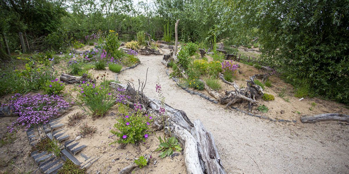 Unsere Tiere und Pflanzen haben sich in den vergangenen Jahrhunderttausenden aneinander angepasst, so dass sie jetzt zusammenpassen wie Schlüssel und Schloss. Wir können also „Tiere pflanzen“, wenn wir einheimische Wildpflanzen verwenden. Eine gute Gestaltung der Fläche und der Pflanzungen betont dann diesen besonderen Wert. Meist werden einzelne Arten, anders als wir sie in der Landschaft vorfinden, in größeren Stückzahlen als Fläche eingesetzt, um eine schöne Wirkung zu erzielen. Auch wenn die Pflanzen in der Natur meist in bunter Gemeinschaft vorkommen, werden über Flächen mit großflächiger Heilziest (Betonica officinalis)-Bepflanzung Gartenwollbienenmännchen ihre Reviere haben, über Hornklee Bläulinge flattern und Resedenmaskenbienen an den Reseden hin- und herflitzen. Schön, wenn die Wildbienen in gebauten Elementen wie Trockenmauern oder Holzbauwerken dann gleich einen Brutraum finden.