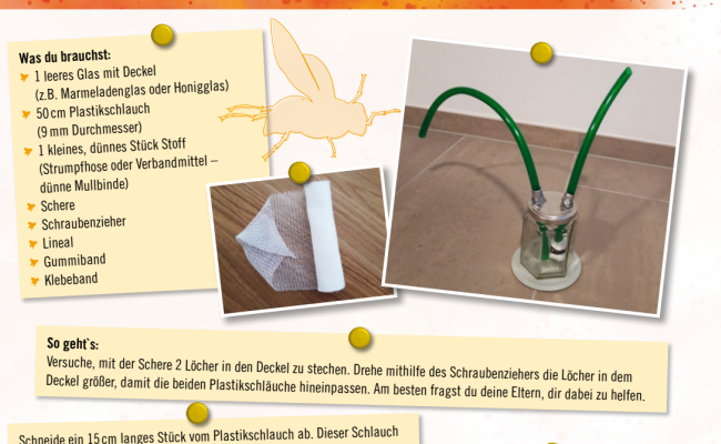 Mit deinem selbstgebauten Insektensauger im Gepäck kannst du dich auf die Suche nach den Krabbeltieren machen und sie schonend einfangen. Vergiss nicht, die Insekten nach deiner Beobachtung wieder freizulassen!